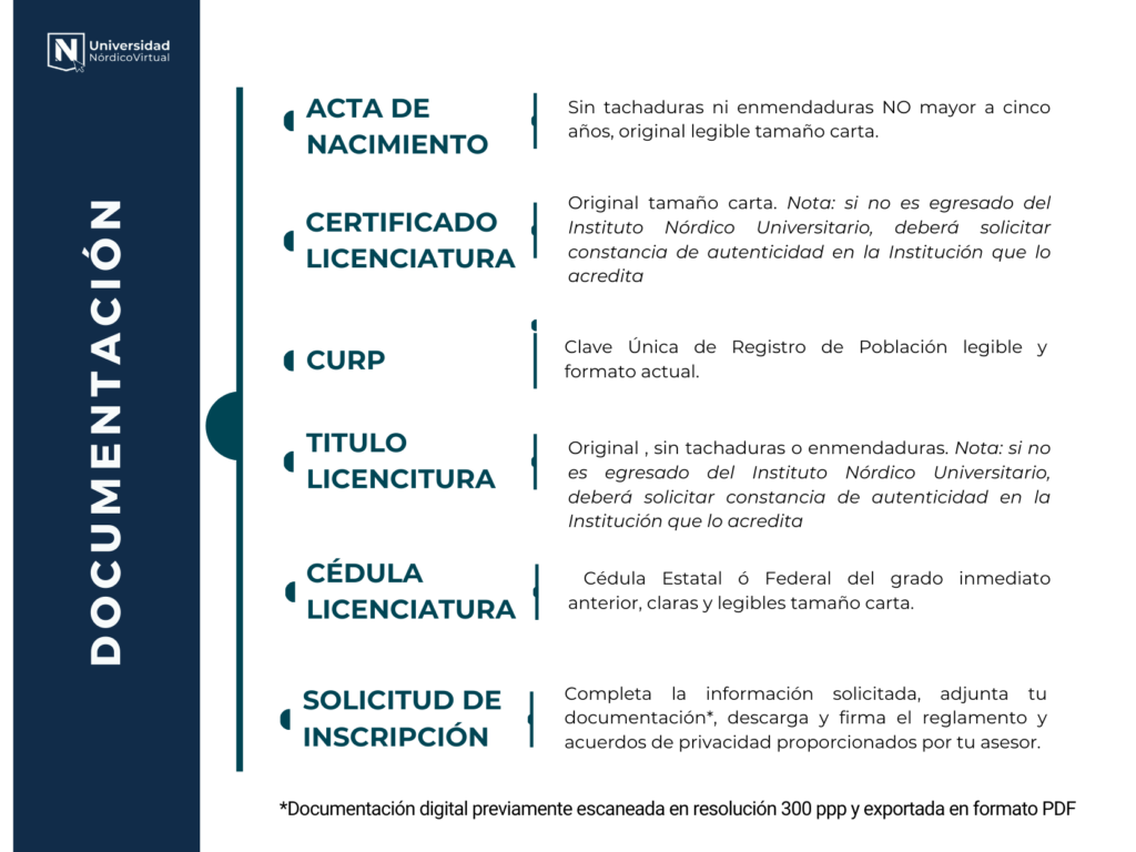 Una vez firmados, deberás subir los documentos escaneados a https://aspirantes.universidadnordicovirtual.com/solicitud-admision, junto con el resto de los requisitos que se mencionan a continuación: